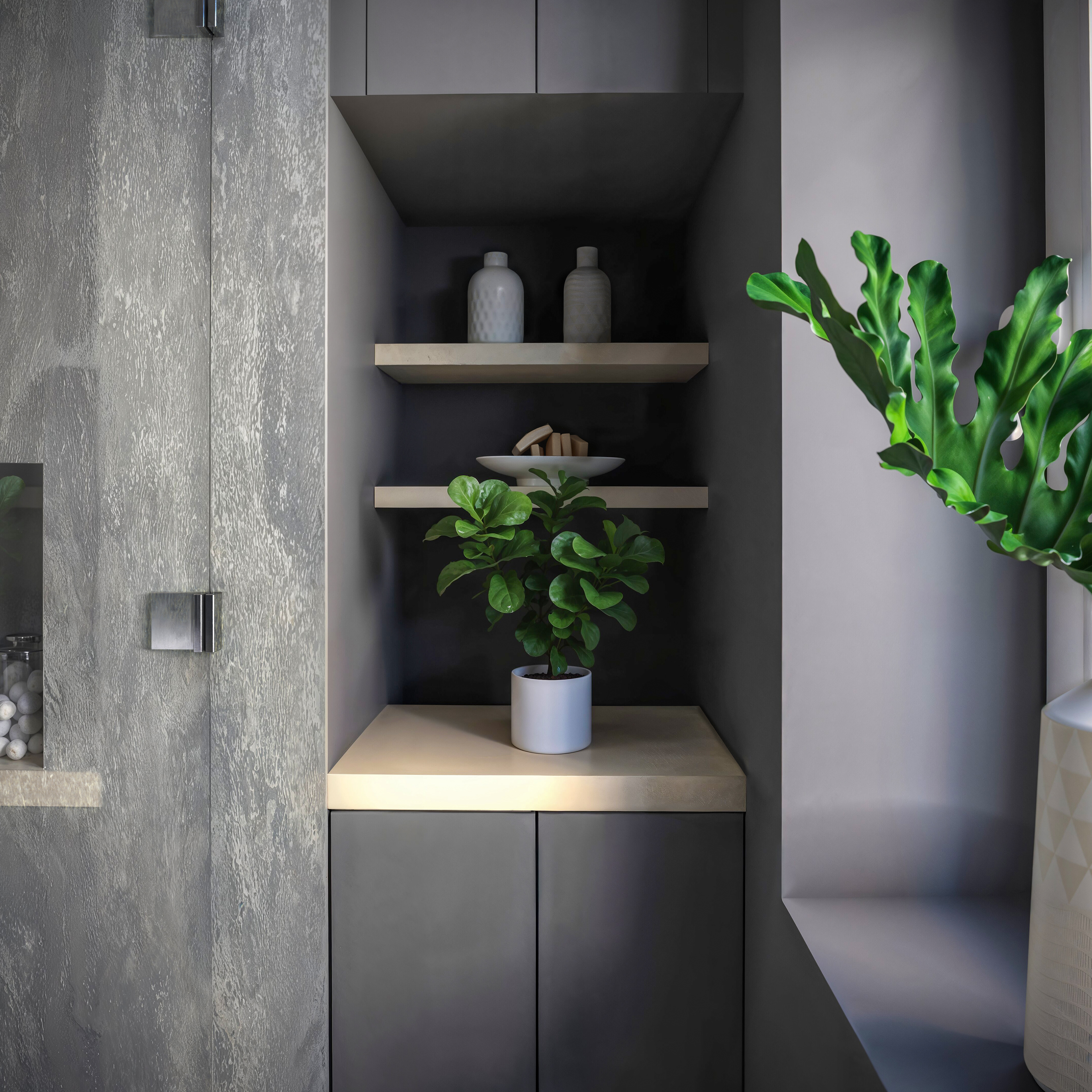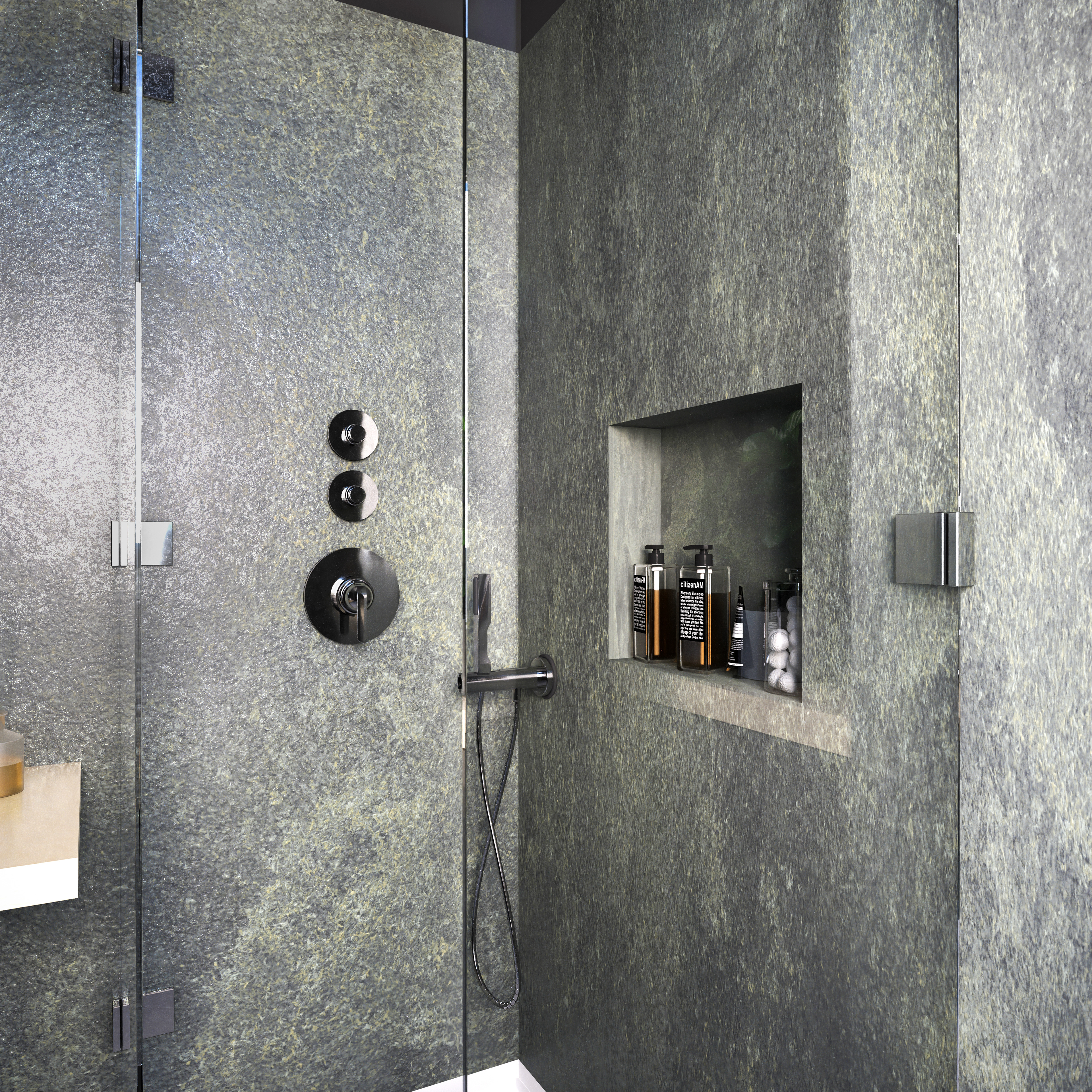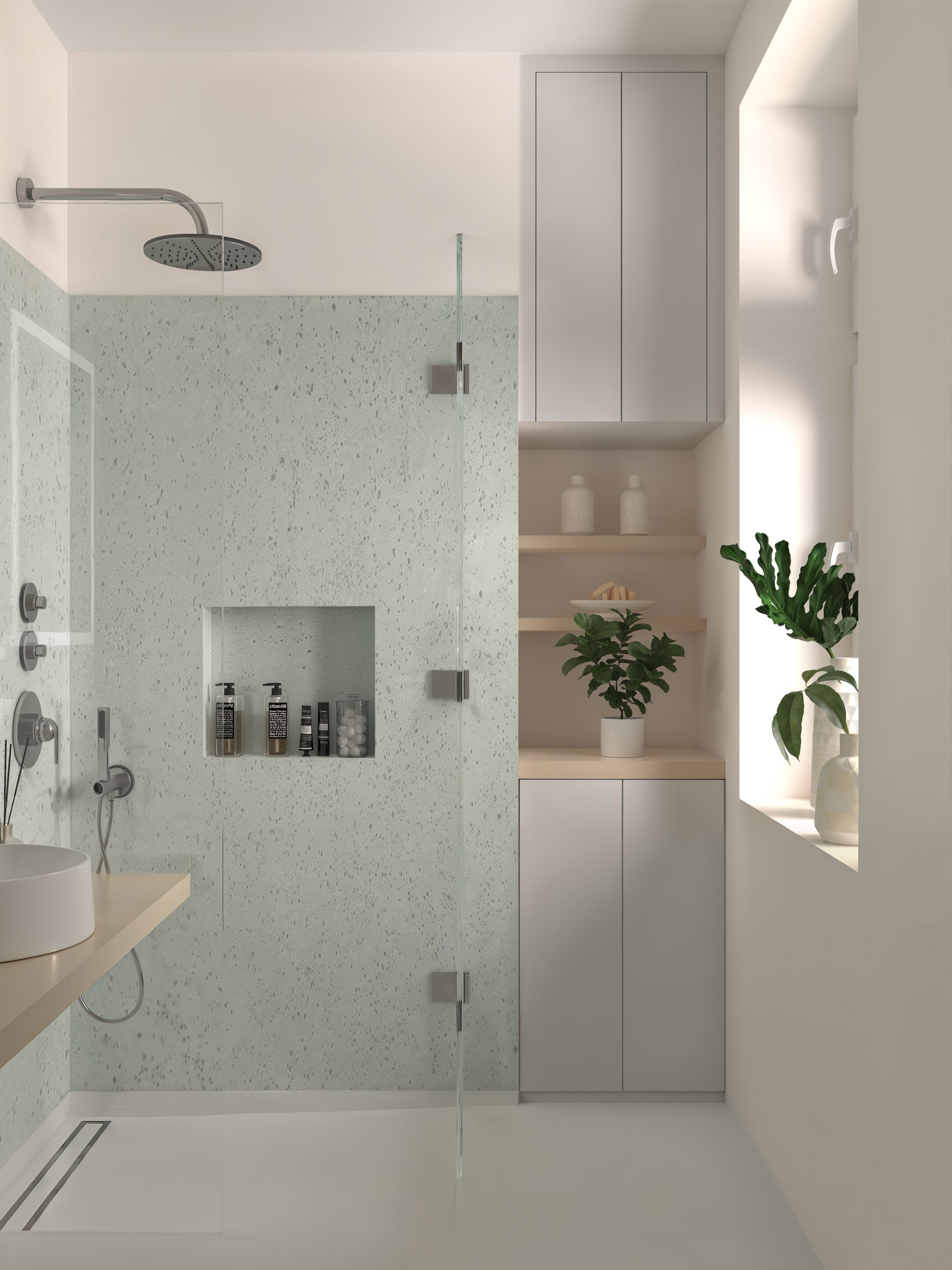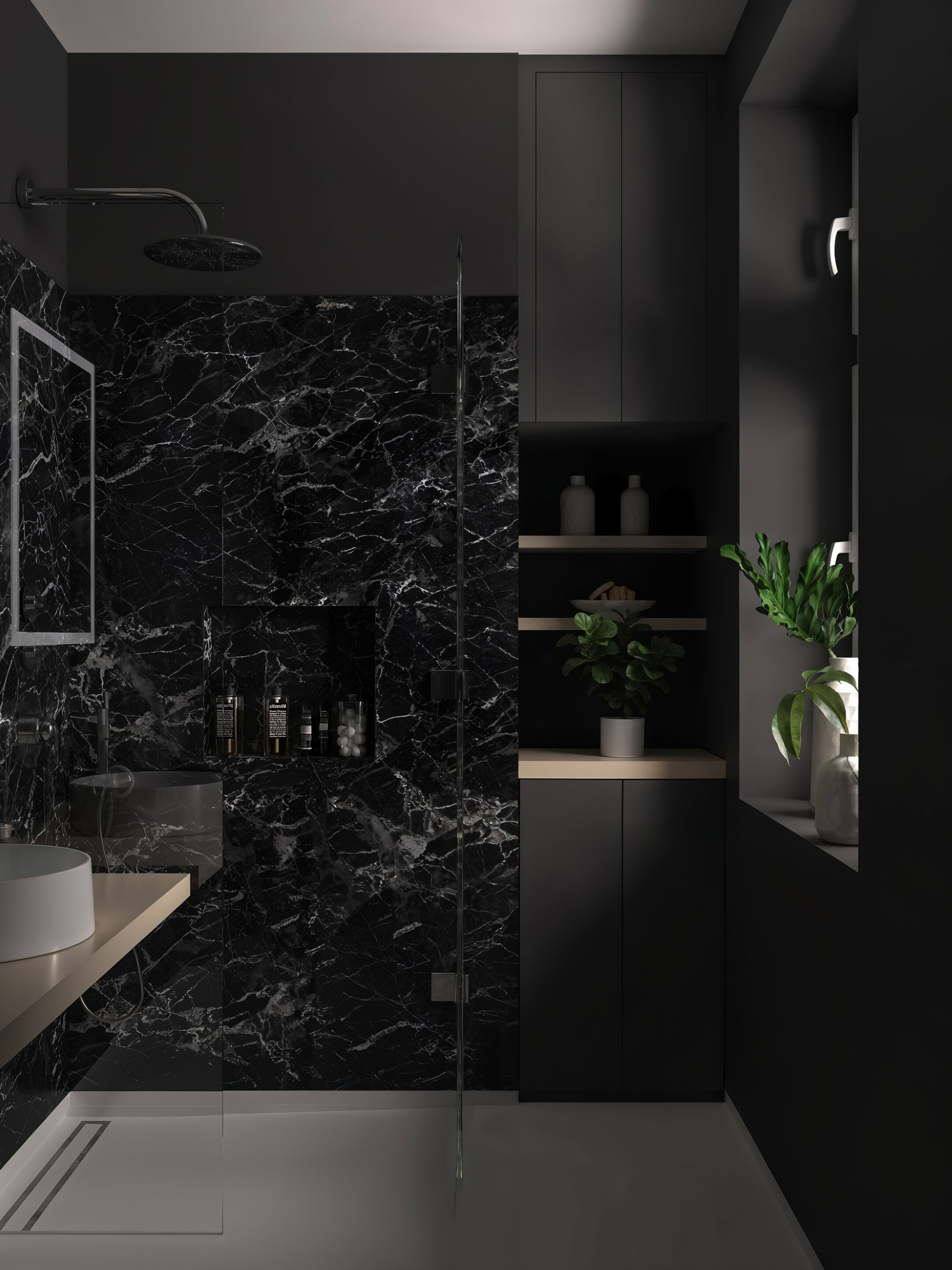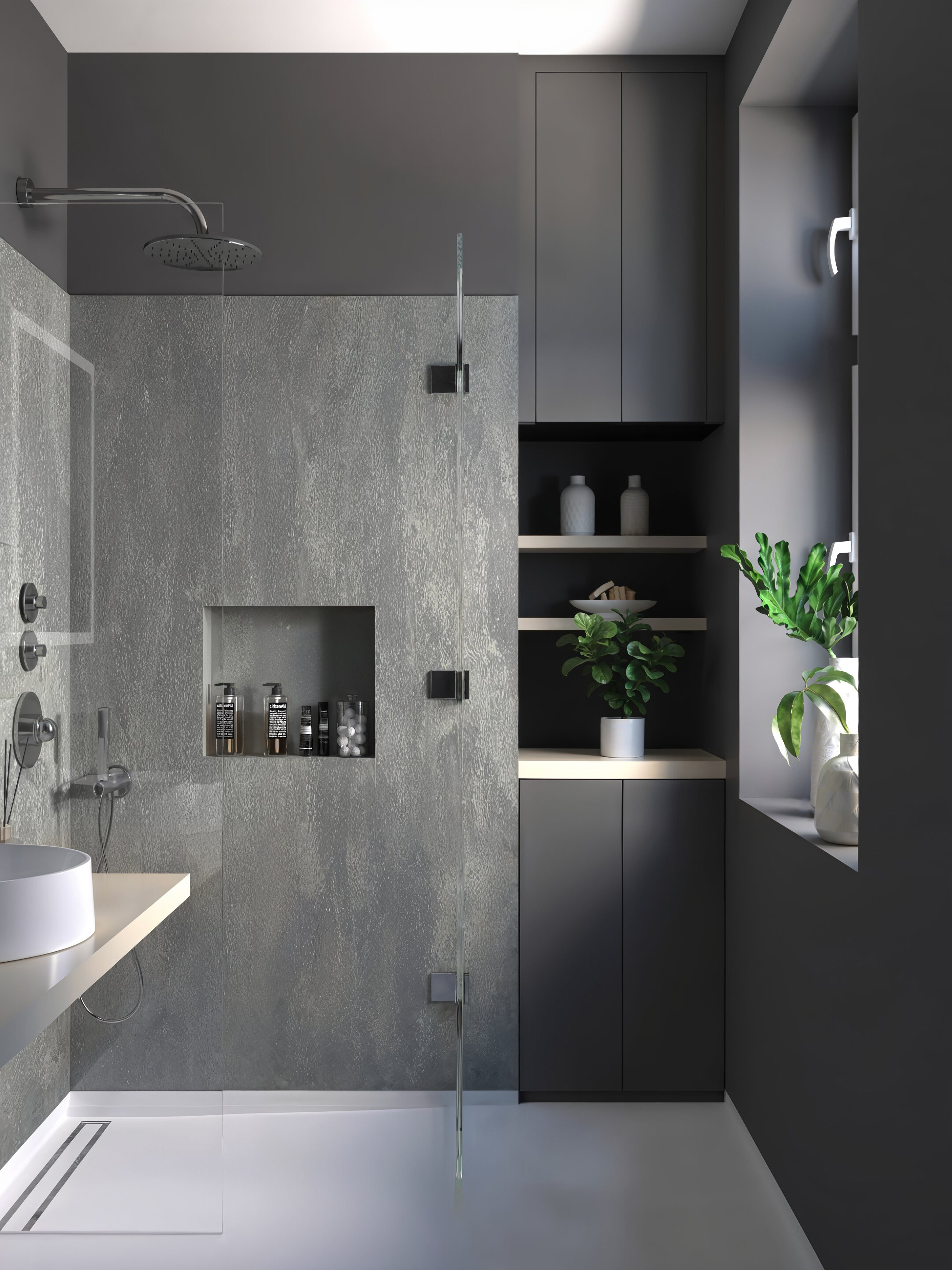 The same bathroom with 3 different tones and emotions all created to give the client a clear material choice and mood of the room.